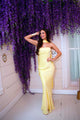 Turn heads in the Bella Satin Maxi Dress – Lemon Glow. A strapless satin gown with a chic scarf detail, designed by Bougieque Texas for elegant women who embody confidence and timeless beauty.