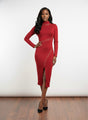 Bold deep-red midi dress with metallic eyelet detailing, a high neckline, long sleeves, and a sculpting fit. Finished with a sleek side slit for the perfect blend of elegance and edge.