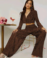 Edith Flounce Sleeve Crop Blouse & Wide Leg Pants Set - Marron